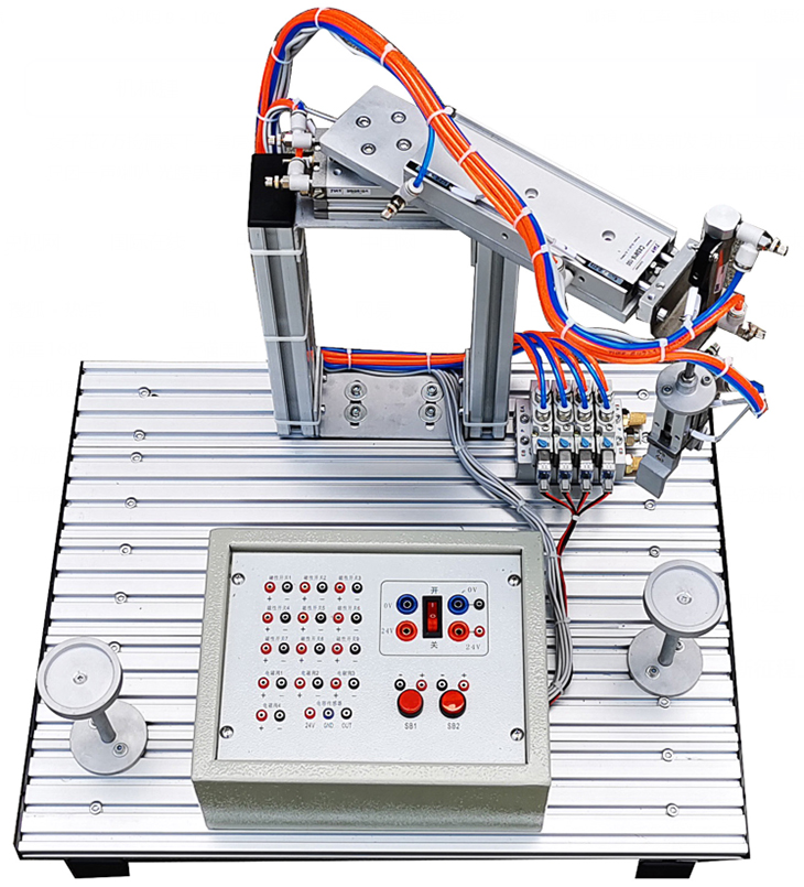17、氣動(dòng)機(jī)械手實(shí)訓(xùn)模型(實(shí)物):本實(shí)訓(xùn)模型是一套完整的氣動(dòng)機(jī)械手搬運(yùn)裝置,由安裝底板、氣動(dòng)手指、單桿提升氣缸、雙導(dǎo)桿伸縮氣缸、旋轉(zhuǎn)擺動(dòng)氣缸、多種類型磁性傳感器、多種類型電磁閥、空氣過濾器、氣源控制滑閥及接線端子排等組成。主要完成物料的搬運(yùn)功能,氣動(dòng)機(jī)械手通過前臂下降,氣動(dòng)手指夾緊物體,手臂縮回,手臂右擺,手臂前伸,前臂下降,手爪松開將物體放到指定位置等動(dòng)作后,機(jī)械手返回原位。將電磁閥及磁性開關(guān)等元件的引出線連接到相應(yīng)的端子接線排上,方便使用。能滿足職業(yè)院校可編程控制器、機(jī)電一體化、氣動(dòng)技術(shù)等相關(guān)課程的實(shí)訓(xùn)教學(xué)、控制電源:DC