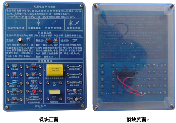 底盒使用190mm×145mm的開模有機透明塑料底盒,模塊面板采用印制電路板PCB工藝,可以直觀看到器件的實物及相關(guān)的原理介紹。方便感性認識、檢測測試,同時也能防止器件的損傷。