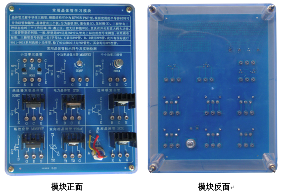 底盒使用190mm×145mm的開模有機透明塑料底盒,模塊面板采用印制電路板PCB工藝,可以直觀看到器件的實物及相關(guān)的原理介紹。對于典型應用及易損器件安裝在面板背面,透過透明底盒能夠看到器件實物,方便感性認識、檢測測試,同時也能防止器件的損傷。