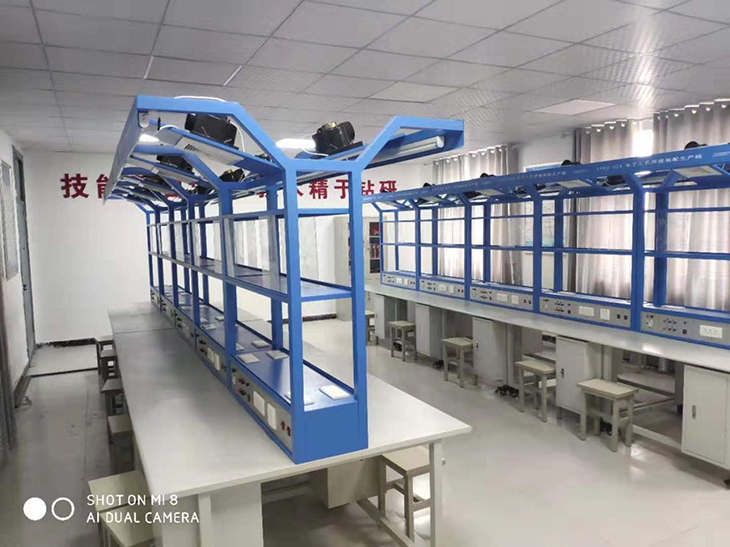 實訓(xùn)臺上提供日光燈(用于照明)2個,透明的PVC板4個,可夾放原理圖等資料,另外還配備三芯雙聯(lián)暗插座4個、兩芯暗插座2個、工具柜2個,工作臺面設(shè)有綠色防靜電桌墊,整個裝配線安全可靠。