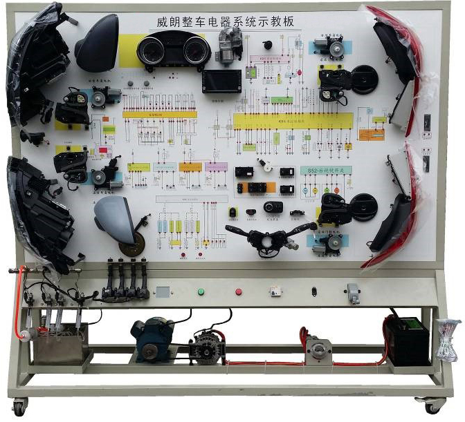 接通電源,操縱示教板上的各種電器開關(guān)、按鈕、真實(shí)演示汽車發(fā)動機(jī)電控系統(tǒng)、儀表系統(tǒng)、燈光系統(tǒng)、雨刮系統(tǒng)、喇叭系統(tǒng)、點(diǎn)火系統(tǒng)、電動車窗系統(tǒng)、電動門鎖、音響系統(tǒng)、起動系統(tǒng)和充電系統(tǒng)等汽車電器各系統(tǒng)的工作過程。