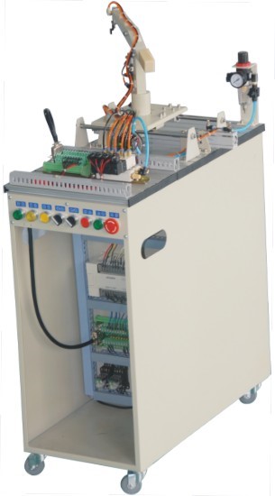 由機械手、橫臂、回轉(zhuǎn)臺、旋轉(zhuǎn)氣缸、開關(guān)電源、可編程序控制器、按鈕、I/O接口板、通訊接口板、電氣網(wǎng)孔板、多種類型電磁閥及氣缸組成,主要完成將工件從上站搬至下一站。