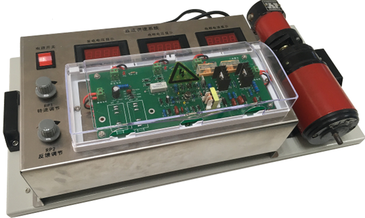 模塊底板采用優(yōu)質(zhì)Q235冷軋鋼板經(jīng)折彎后焊接而成,表面靜電噴塑處理。底板上裝有兩個黑色鑄鋁拉手,方便搬運。底板上方有直流電機、測速發(fā)電機、直流調(diào)速線路板、顯示系統(tǒng)等組成。該模塊采用測速發(fā)電機反饋電壓和給定電壓形成閉環(huán)調(diào)速系統(tǒng),調(diào)速系統(tǒng)由給定電壓、轉(zhuǎn)速負反饋、放大電路、觸發(fā)產(chǎn)生電路及主電路組成。學員根據(jù)功能要求進行測量分析,完成故障診斷與排除。