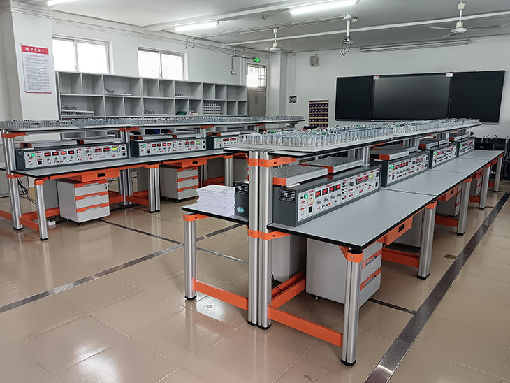 裝置由實訓(xùn)主機(jī)箱、儀器架、功能網(wǎng)孔板(掛放工具、看板、元件盒)、實驗桌(裝有透明創(chuàng)新實訓(xùn)模塊固定插板)、移動矮柜、透明創(chuàng)新實驗?zāi)K、學(xué)生凳等組成。實訓(xùn)裝置支架與實訓(xùn)桌可組合、可拆裝。