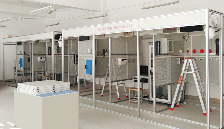 由鋁合金型材框架和安裝布線網(wǎng)孔板組成3120mm×1580mm×2310mm(長(zhǎng)×寬×高),分為智能大樓(小區(qū))、管理中心,器件采用自攻螺絲和工程塑料卡件配合安裝。 |