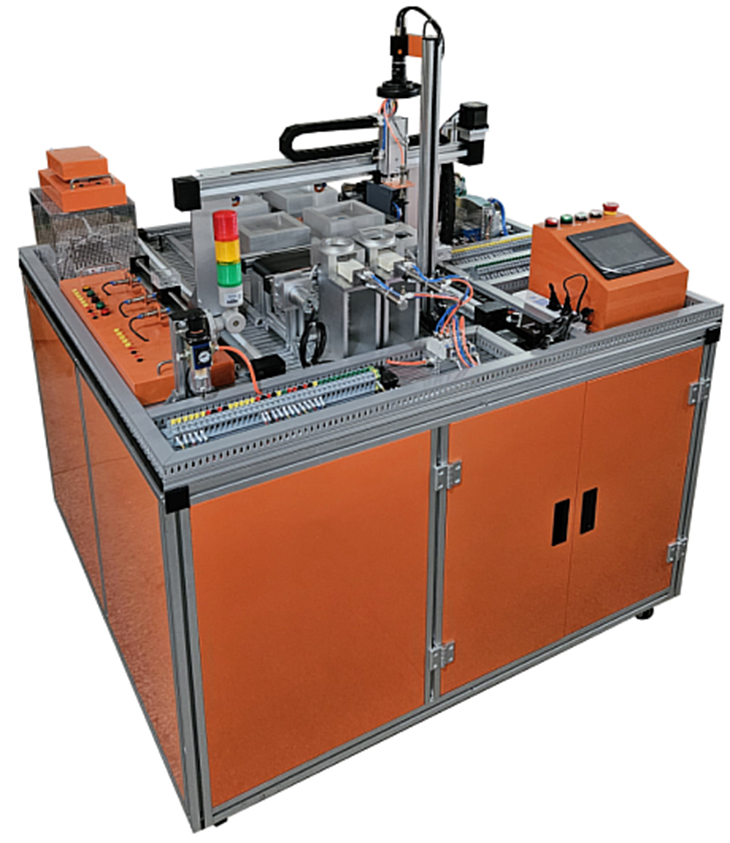 ★1、電氣智能化系統(tǒng)安裝技術實訓裝置,電氣智能化系統(tǒng)安裝技術實訓臺,電氣智能化系統(tǒng)安裝技術實訓設備包括電氣接線模塊、上料模塊、輸送線模塊、視覺識別模塊、三維模組控制模塊、稱重模塊、RFID產(chǎn)品溯源模塊、物料擺放模塊、小車運動控制模塊、溫控箱變頻控溫模塊。提供符合上述要求的裝置整體設計效果圖。
