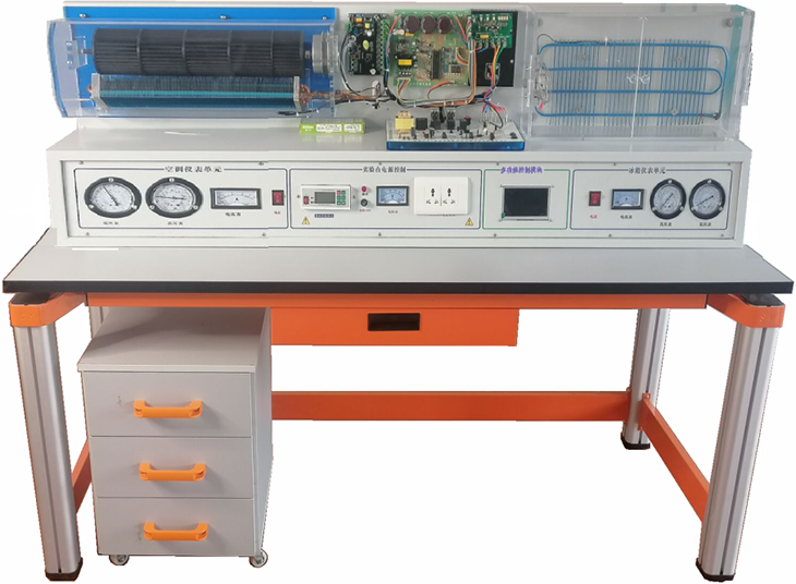 B)實驗平臺為1.5MM板金制作,形狀L形,空調(diào)室內(nèi)機為壁掛式,可以掛在平臺上,整機含空調(diào)系統(tǒng)、電冰箱系統(tǒng)、電氣控制系統(tǒng)等組成。