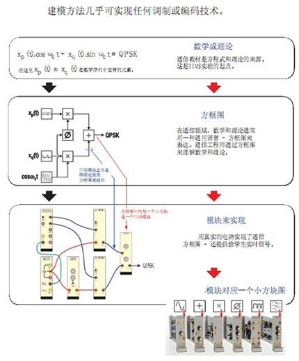 通信系統(tǒng)原理實驗室主要設備采用設計型開放式設計理念,跟以往驗證型實驗設備有本質區(qū)別。整個系統(tǒng)采用基于方框圖的模塊化設計,以數學函數方框圖形式來確定硬件基本模塊,靈活組合模塊以實現任何調制或編碼技術。
