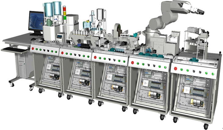 機(jī)電一體化綜合實(shí)訓(xùn)考核系統(tǒng)是基于國(guó)家中長(zhǎng)期人才發(fā)展規(guī)劃綱要,對(duì)經(jīng)濟(jì)社會(huì)發(fā)展重點(diǎn)領(lǐng)域急需緊缺專門人才培養(yǎng)的需要,依據(jù)國(guó)家相關(guān)職業(yè)工種培養(yǎng)及鑒定標(biāo)準(zhǔn),結(jié)合中國(guó)當(dāng)前制造業(yè)的崗位需求設(shè)計(jì)研發(fā)。機(jī)電一體化綜合實(shí)訓(xùn)考核系統(tǒng)由"工作站"形式綜合體現(xiàn),"工作站"包含機(jī)電一體化"工作島",電氣裝配臺(tái),機(jī)械裝配臺(tái),工具、資料柜及其他附屬工作設(shè)施,不但讓操作者在工作中實(shí)習(xí)訓(xùn)練了機(jī)電專業(yè)技能,同時(shí)也體驗(yàn)到職業(yè)素養(yǎng)中的社會(huì)能力與方法能力。"工作站"的核心是"工作島",由MPS模塊化生產(chǎn)線設(shè)備組成,共分為液體混合灌裝、組裝加工、檢測(cè)判別、機(jī)器人和智能倉(cāng)儲(chǔ)五個(gè)工作島設(shè)備組成,工作島由PLC、變頻器、伺服驅(qū)動(dòng)、步進(jìn)驅(qū)動(dòng)、氣動(dòng)元件、觸摸屏等工業(yè)控制器件構(gòu)成,操作者需要具備機(jī)械裝調(diào)、電氣管路連接、程序設(shè)計(jì)、機(jī)器人操作、傳感器裝調(diào)、檢修排故、觸摸屏組態(tài)等現(xiàn)代制造業(yè)崗位必要的技能,設(shè)備技術(shù)涵蓋面廣,定位具有前瞻性,是機(jī)電一體化專業(yè)教學(xué)實(shí)習(xí)、技能鑒定和技能競(jìng)賽的絕佳載體。