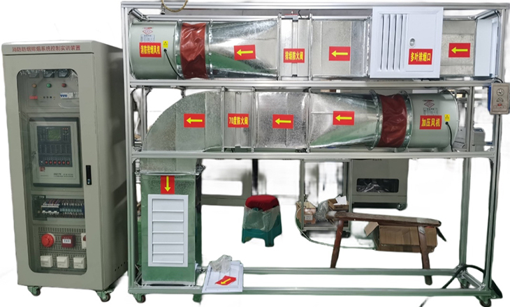 防煙排煙系統(tǒng)實(shí)訓(xùn)裝置由模擬房間配備系統(tǒng)和排煙風(fēng)機(jī)系統(tǒng)組成(主要由風(fēng)口、風(fēng)閥、排煙窗和排煙風(fēng)機(jī)、排煙防火閥、送風(fēng)機(jī)、送風(fēng)風(fēng)道以及排煙風(fēng)道和相關(guān)的火災(zāi)探測器、聯(lián)動控制系統(tǒng)組成。