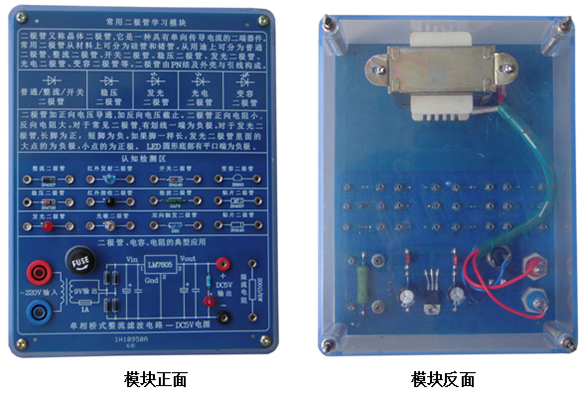 提供二極管、電容、電阻的綜合應用電路:單相橋式整流濾波電路-DC5V電源的產生電路,帶有熔絲保護及發(fā)光二極管指示,通入單相AC220市電即可工作(模塊設有單相電源變壓器),同時該DC5V電源可為其他模塊檢測供電之用。