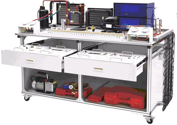 1、制冷制熱實訓臺采用鋁型材臺架加實訓模塊結構,裝置采用一體化設計,由導軌式 鋁合金安裝平臺、空調系統(tǒng)、電冰箱系統(tǒng)、電氣控制系統(tǒng)等組成。底部安裝有四個帶剎車的腳輪,可以方便的移動和固定。設備配置空調制冷系統(tǒng)管路1套、直冷電冰箱制冷系統(tǒng)管路1套、安全插端子排,壓力表(1.5MPa)