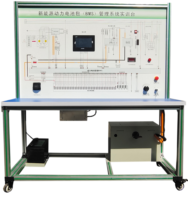 磷酸鐵鋰動(dòng)力電池包與鐵制電池箱(單體電池3.2V 20AH,24串)、BMS鋰電管理一體機(jī)、動(dòng)力電池包觸摸顯示屏、車載充電機(jī)、國(guó)標(biāo)充電插口、國(guó)標(biāo)充電槍、緊急斷電開關(guān)、霍爾電流傳感器、直流接觸器(包含充電繼電器、總正繼電器、總負(fù)繼電器、預(yù)充繼電器)、DC-DC轉(zhuǎn)換器(72V-12V30A)、輔助蓄電池(12V45AH)、放電控制繼電器與放電負(fù)載電阻、預(yù)充電阻器、可移動(dòng)實(shí)訓(xùn)臺(tái)(1500×700×1700mm 帶自鎖腳輪裝置,帶安裝檢測(cè)端子的原理面板,面板1448×940mm)、故障模擬與排除裝置、設(shè)備操作說(shuō)明書。