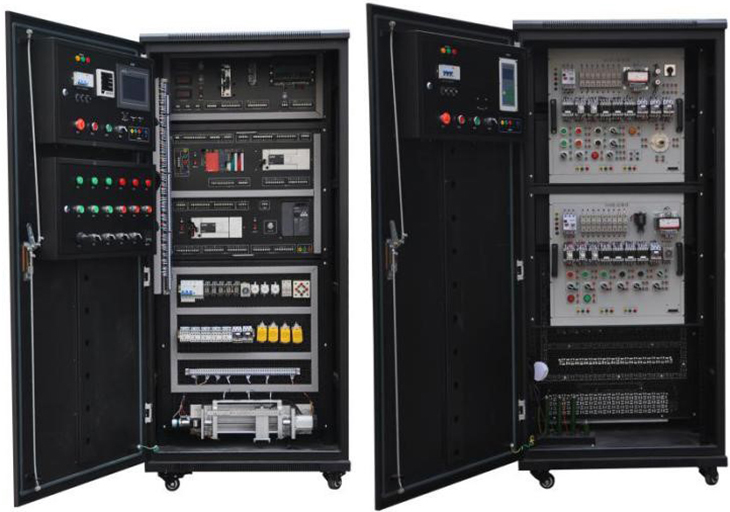 1.本裝置是由控制柜、受控對象等組成一個完整系統(tǒng),具有占地面積小、操作方便、可移動、內(nèi)部安裝有照明設施、操作面板,各控制點和通訊接口均引出到專用的接線板上,使實訓更加便捷。
