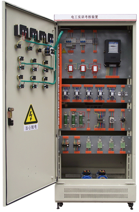 該裝置按標(biāo)準(zhǔn)電氣控制柜設(shè)計(jì)制造規(guī)格,充分利用雙面位置,柜內(nèi)裝有完成各種照明電路所需的單相電度表、日光燈、單聯(lián)開關(guān)、插座、感應(yīng)開關(guān)、漏電開關(guān)等,以及電氣控制所需要的多種低壓電器,如漏電斷路器、熔斷器、電流互感器、交流接觸器、時(shí)間繼電器、熱繼電器、中間繼電器、行程開關(guān)、按鈕、信號(hào)燈、轉(zhuǎn)換開關(guān)、電壓表、電流表、功率表及電度表等,為了延長(zhǎng)電器使用壽命,各電器的接點(diǎn)都與接線端子相連,再由接線端子與被控制電氣連接。