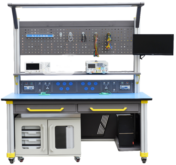 該設(shè)備主要由工作臺、實訓(xùn)屏、實訓(xùn)屏模塊、工具柜、電路實訓(xùn)模塊