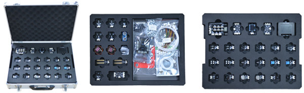 模塊包含LED燈模塊、按鍵模塊、RGB彩燈模塊、蜂鳴器模塊、人體感應(yīng)傳感器、光敏傳感器、溫度傳感器、濕度傳感器、OLED顯示模塊、模擬量傳感器、直流電機(jī)模塊、氣壓傳感器模塊等十五余種模塊、傳感器通過4P連接線連接到通用擴(kuò)展板。