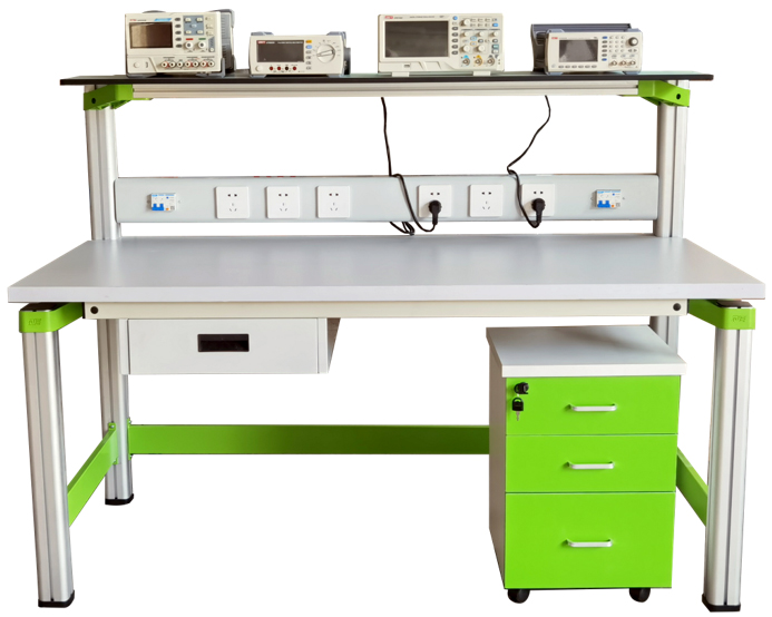 實驗桌后面二支截面尺寸70mm×70mm桌腳向上延伸,與一次成型鋁壓鑄框架連接構(gòu)件構(gòu)成(非焊接工藝)牢固的支架,與儀器架、電源控制箱組成一個完整的實訓(xùn)屏。