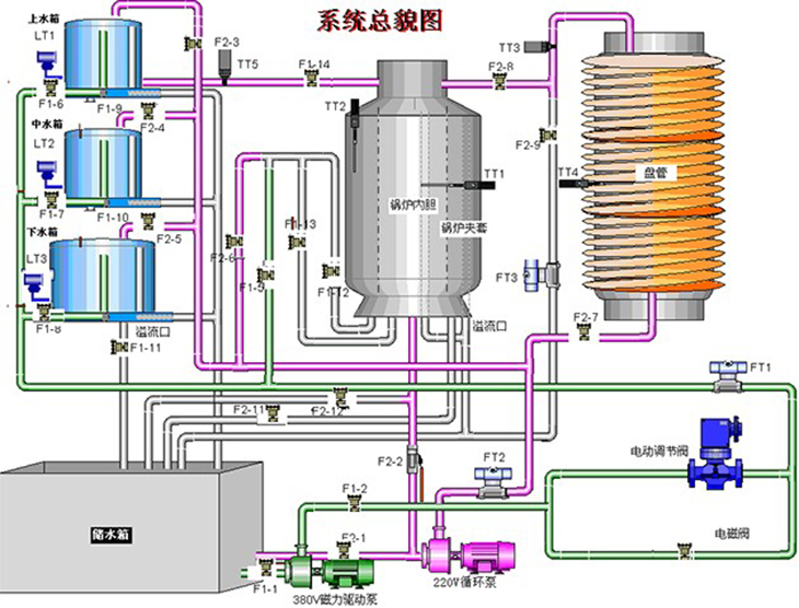 實(shí)驗(yàn)對(duì)象系統(tǒng)包含有:不銹鋼儲(chǔ)水箱;上、中、下三個(gè)串接有機(jī)玻璃圓筒型水箱;三相4.5kW電加熱鍋爐(由不銹鋼鍋爐內(nèi)膽加溫筒和封閉式外循環(huán)不銹鋼冷卻鍋爐夾套構(gòu)成)和鋁塑盤(pán)管組成。