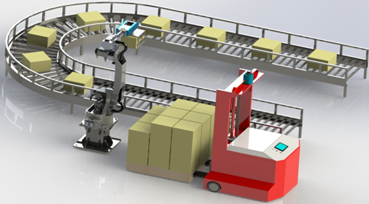 碼垛機(jī)器人系統(tǒng)由機(jī)器人、來(lái)料流水線、托盤(pán)、AGV叉車(chē)、安全圍欄及電氣系統(tǒng)構(gòu)成。產(chǎn)品通過(guò)來(lái)料流水線輸送至機(jī)器人工作站內(nèi),系統(tǒng)檢測(cè)到有產(chǎn)品進(jìn)入搬運(yùn)區(qū)域,機(jī)器人自動(dòng)運(yùn)行,將產(chǎn)品碼放在托盤(pán)上。碼盤(pán)完成AGV叉車(chē)將碼好的托盤(pán)叉至薄膜纏繞機(jī)進(jìn)型固定。碼垛機(jī)器人教學(xué)系統(tǒng)內(nèi)部裝有碼垛軟件,自動(dòng)計(jì)算每個(gè)擺放的層數(shù)及位置,托盤(pán)擺滿后,托盤(pán)輸送線將托盤(pán)推出機(jī)器人系統(tǒng),等待轉(zhuǎn)運(yùn)。該系統(tǒng)最大可能的模擬實(shí)際生產(chǎn)時(shí),設(shè)備運(yùn)行的方式及可能出現(xiàn)的狀況,對(duì)學(xué)生掌握機(jī)器人的操作及了解實(shí)際工廠的生產(chǎn)流程有極大的幫助。另外,根據(jù)具體要求,系統(tǒng)還可以增加視頻監(jiān)控,根據(jù)工件種類(lèi)掃碼分類(lèi)等功能。