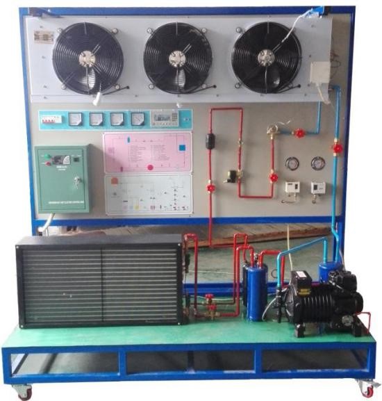 工業(yè)制冷系統(tǒng)實訓(xùn)考核裝置主要由半封閉式制冷壓縮機(jī)、冷凝器、蒸發(fā)器、膨脹閥和故障設(shè)置開關(guān)、測試儀表等組成。實訓(xùn)臺通過手閥開關(guān)和鈕子開關(guān)分別來設(shè)置管路系統(tǒng)和電控系統(tǒng)的 20 多種故障。設(shè)備采用先進(jìn)的電控系統(tǒng)并具有具有開相,缺相, 過流等保護(hù)功能。蒸發(fā)器風(fēng)扇采用變頻器控制速度。配備 8 路溫度計,電壓表,電流表,功率表,功率因數(shù)表和壓力表,能實時觀察運行參數(shù)