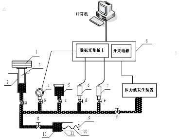 實(shí)驗(yàn)裝置主要由穩(wěn)態(tài)壓力波發(fā)生裝置、工業(yè)用遠(yuǎn)傳壓力表、低響應(yīng)頻率的壓力傳感器、高頻壓力傳感器、開(kāi)關(guān)電源、數(shù)據(jù)采集板卡、計(jì)算機(jī)以及管路組成,系統(tǒng)結(jié)構(gòu)簡(jiǎn)圖如圖1所示。