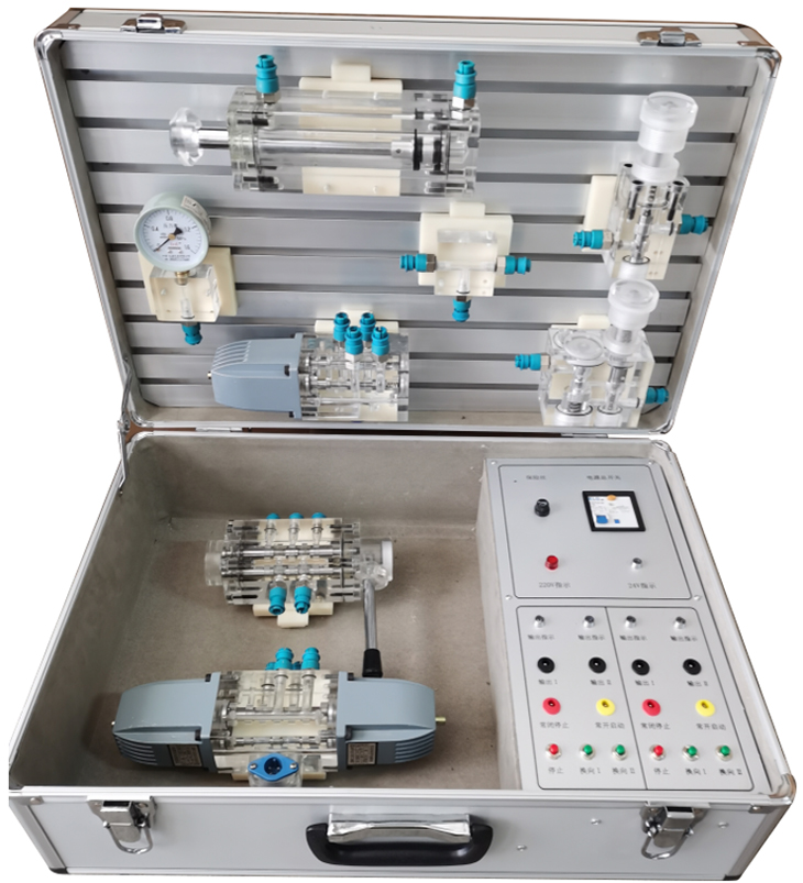 3、箱子集元件元件、液壓泵站、調(diào)速電機(jī)及電氣控制部分為一體箱,教師可方便的將設(shè)備帶入課堂進(jìn)行現(xiàn)場演示教學(xué)和實物講解。