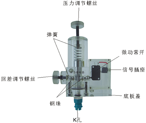 2、壓力繼電器其殼體,底板蓋采用了進口透明有機玻璃材料精制而成,閥芯采用45#中碳鋼材料,安裝了微動開關(guān)及信號插座。配合彈簧,油接頭,密封圈、鋼珠、內(nèi)六角螺絲等標(biāo)準件裝配而成,通過它可明確地觀察到閥芯、彈簧、鋼珠等結(jié)構(gòu)及其在壓力油作用下的運動過程和觸點通斷。