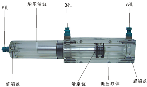 2、增壓油缸的前端、后端蓋、低壓缸體、增壓缸體等均采用了進口透明有機玻璃材料精制而成,透明清晰,活塞桿采用了合金鋁材料,并配合油接頭,密封圈,內(nèi)六角螺絲等標(biāo)準件裝配而成,通過它可明確地觀察到活塞桿,油封,油孔等結(jié)構(gòu)及其運行過程,具有形象逼真,性能可靠等優(yōu)點,它既可作為教學(xué)模型,也可以液壓實驗元件進行實驗演示。