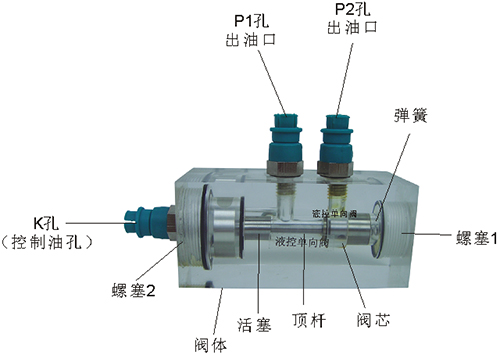 2、液控單向閥結(jié)構(gòu)上參考了國產(chǎn)IY-25B型液壓單向閥,其閥體、螺塞等采用了進口透明有機玻璃材料精制而成,閥芯、頂桿采用了45#中碳鋼材料,并配合彈簧,油接頭,密封圈等標(biāo)準件裝配而成,通過它可明確地觀察到活塞、彈簧、油孔等結(jié)構(gòu)及其運行過程,具有形象逼真,性能可靠等優(yōu)點。它即可作為教學(xué)模型,也可以作為液壓實驗元件進行實驗演示。