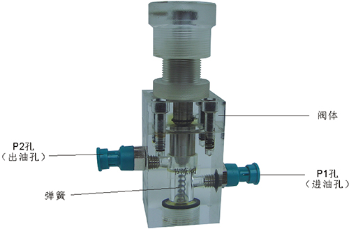 2、溢流閥結(jié)構(gòu)上參考了國產(chǎn)P-63B型低壓直動式溢流閥,其閥體閥蓋、鎖緊螺母、調(diào)節(jié)螺母、螺塞等采用了進口透明有機玻璃材料精制而成,閥芯、調(diào)節(jié)桿采用了45#中碳鋼材料。并配合彈簧,油接頭,密封圈等標(biāo)準件裝配而成,通過它可明確地觀察到閥芯、彈簧、油孔等結(jié)構(gòu)及其運行過程,具有形象逼真,性能可靠等優(yōu)點。它即可作為教學(xué)模型,也可以作為液壓實驗元件進行實驗演示。