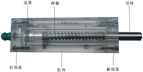 2、彈簧回位油缸的缸體,端蓋等均采用了進口透明有機玻璃材料精制而成,透明清晰,頂桿采用45#中碳鋼材料,并配合油接頭、密封圈、內(nèi)六角螺絲等標(biāo)準件裝配而成,通過它可明確地觀察到活塞、頂桿、油封、油孔、彈簧等結(jié)構(gòu)及其運行過程,具有形象逼真,性能可靠等腰三角優(yōu)點,它即可作為教學(xué)模型,也可作為液壓實驗元件進行實驗演示。