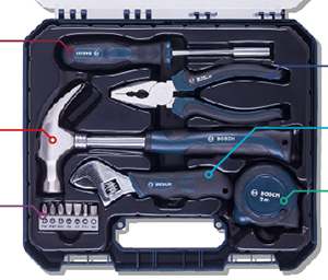 | 23 | 成套工具箱 | 12件套:鋼絲鉗、6*38螺絲批2只、沾塑活扳手、數(shù)顯電筆、0.25KG羊角錘、鋼卷尺、美工刀、PVC膠布/6*100螺絲批2只/吹塑盒1只