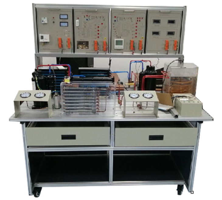 實訓桌采用工業(yè)標準鋁型材件與鈑金結構件拼裝而成,結構堅固,造形美觀大方;設有二個大抽屜,用于放置實訓導線或工具等。實訓桌臺面用于放置熱泵型家用空調和空氣源熱泵系統(tǒng)的元器件并提供一個寬敞舒適的工作臺面,學生可以在工作臺面上將制冷系統(tǒng)的器件任意安裝,實訓桌還設有四個萬向輪,便于移動和固