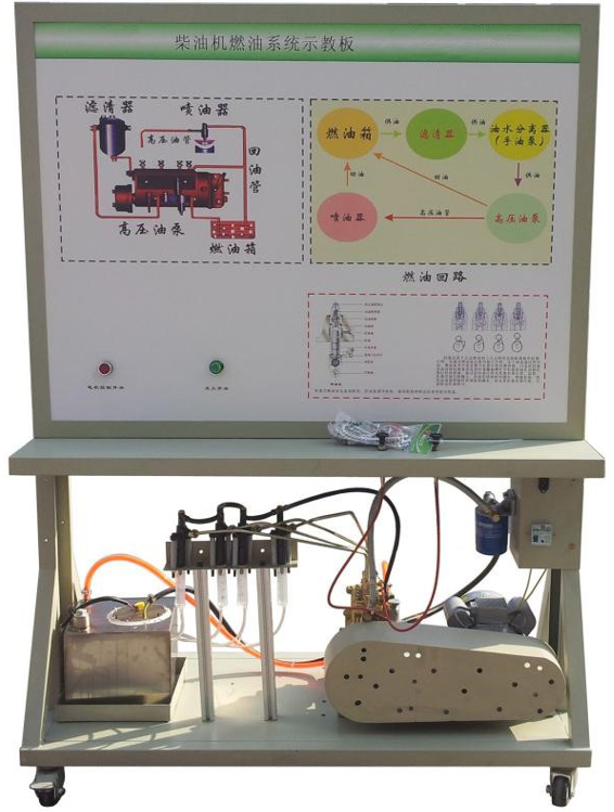 2.實訓臺面板采用4mm厚耐腐蝕、耐創(chuàng)擊、耐污染、防火、防潮的高級鋁塑板,表面經特殊工藝噴涂底漆處理;面板打印有永不褪色的彩色電路圖;學員可直觀對照電路圖和電控高壓共軌柴油發(fā)動機實物,認識和分析控制系統(tǒng)的工作原理。