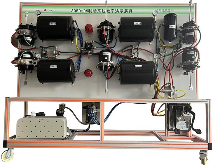 1.臺架上具有的全新天錦EQ1120GA原車零部件有空氣壓縮機(jī)總成、空氣干燥劑、前橋儲氣筒、后橋儲氣筒、手制動儲氣筒、再生儲氣筒、輔助儲氣筒、四回路保護(hù)閥、制動腳閥、駐車閥、ABS電磁閥、繼動閥、制動管路、氣壓表若干個。