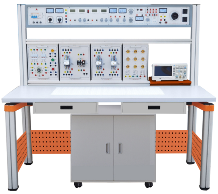 裝置由主機(jī)箱、實(shí)驗(yàn)桌、實(shí)訓(xùn)屏、實(shí)訓(xùn)掛箱、移動(dòng)矮柜、示波器架、學(xué)生凳等組成。實(shí)訓(xùn)裝置支架與實(shí)訓(xùn)桌可組合、可拆裝。支架與桌腳一體,鋁合金結(jié)構(gòu),實(shí)訓(xùn)掛箱、各實(shí)驗(yàn)?zāi)K可根據(jù)實(shí)驗(yàn)需求自由組合放置。