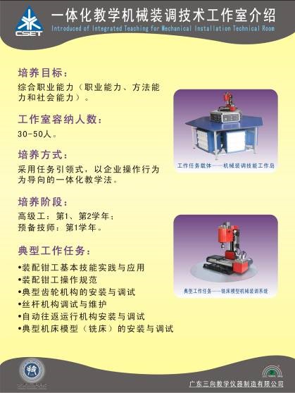 | 工作室介紹宣傳掛板 | 明確設(shè)備所培養(yǎng)目標(biāo)、方式、階段、典型工作任務(wù)等。 | 各技能島工作室墻面或主體,顯而易見處懸掛或張貼。 |