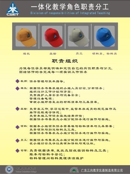 根據(jù)學(xué)員不同角色穿著不同顏色工作服或工作帽。隨著教學(xué)開展輪流執(zhí)行管理設(shè)備/審核物料清單 負(fù)責(zé)評(píng)估學(xué)員工作任務(wù)結(jié)果 執(zhí)行任務(wù) 負(fù)責(zé)領(lǐng)取/歸還物料及工具