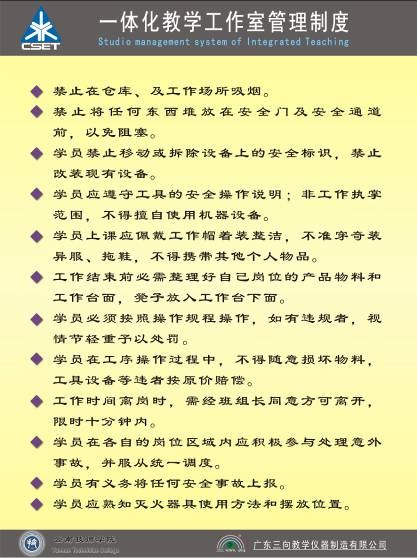 | 一體化教學(xué)管理制度掛板 | 明確工作室相關(guān)管理制度,對(duì)安全,責(zé)任、行為等方面加以強(qiáng)調(diào) | 一體化各工作室 |
