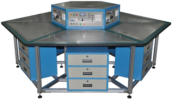 六邊形電源控制屏:電源控制屏采用六邊形結(jié)構(gòu),與工作臺(tái)相對(duì)應(yīng)?蚣懿捎脙(yōu)質(zhì)鞍鋼盒裝鋼板,經(jīng)過機(jī)械加工成型,外表面噴涂彩色環(huán)氧聚塑。六個(gè)作業(yè)面均配置有實(shí)訓(xùn)電源及主機(jī)控制系統(tǒng),控制面板具有漏電保護(hù)、短路保護(hù)功能。電源控制屏頂面采用10mm厚的鋁框包邊,內(nèi)置有直徑為850mm的多角度公共操作平臺(tái),公共操作平臺(tái)能360°旋轉(zhuǎn),能做120°定位,平臺(tái)頂板采用10mm厚的鋁板加工成型,能載重約60Kg的典型工作任務(wù)。