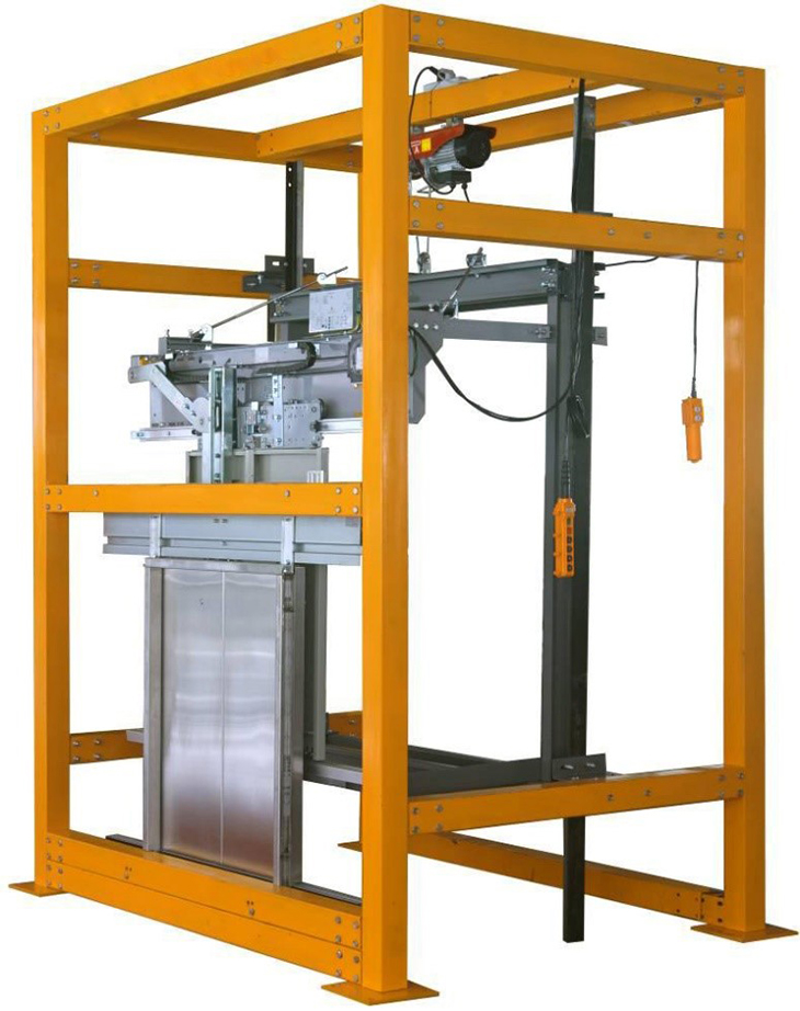 本裝置主要由鋼結(jié)構(gòu)框架、電動(dòng)葫蘆、門(mén)框、層門(mén)門(mén)扇、層門(mén)地坎、層門(mén)上坎、轎廂龍門(mén)架、轎廂門(mén)扇、轎廂門(mén)地坎、門(mén)機(jī)、導(dǎo)軌、導(dǎo)軌支架、導(dǎo)靴等部件組成。學(xué)生根據(jù)隨機(jī)文件資料說(shuō)明,在鋼結(jié)構(gòu)框架內(nèi)進(jìn)行安裝與調(diào)整,使其符合電梯門(mén)系統(tǒng)相關(guān)規(guī)范要求。并通過(guò)轎廂架的上下運(yùn)動(dòng)模擬轎廂在井道中的運(yùn)行,當(dāng)平層時(shí),門(mén)機(jī)構(gòu)能夠帶動(dòng)轎廂門(mén)與層門(mén)開(kāi)閉,轎廂離開(kāi)后,層門(mén)緊閉。另外,能夠使學(xué)生直觀地看到門(mén)機(jī)構(gòu)的全部器件及整個(gè)機(jī)械動(dòng)作過(guò)程,更有效地幫助學(xué)生掌握其工作原理。