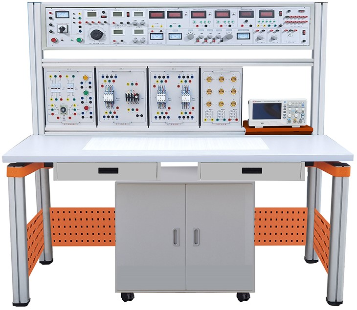 裝置由主機箱、實訓桌、實訓屏、實訓掛箱、移動矮柜、示波器架、學生凳等組成。實訓裝置支架與實訓桌可組合、可拆裝。支架與桌腳一體,鋁合金結(jié)構(gòu),實訓掛箱、各實訓模塊可根據(jù)實訓需求自由組合放置。