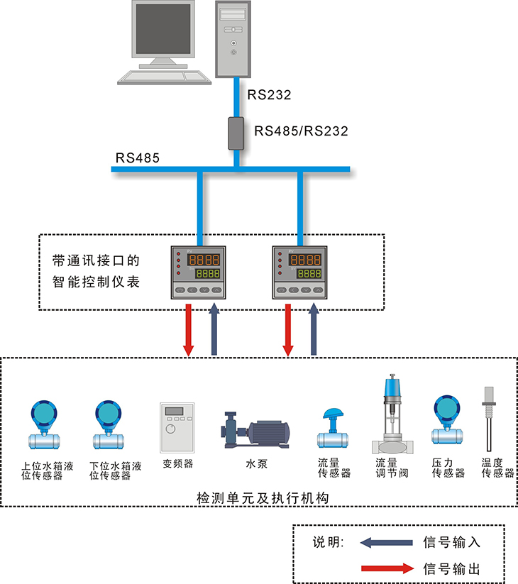 儀表控制系統(tǒng)核心為帶通信功能的各種儀表,儀表內(nèi)集成了各種算法,根據(jù)現(xiàn)場(chǎng)情況整定儀表控制算法的各種參數(shù),達(dá)到控制效果。同時(shí)帶通訊功能的儀表與上位計(jì)算機(jī)的軟件平臺(tái)通訊。儀表各種參數(shù)和過程值進(jìn)入軟件平臺(tái)(一般為工控組態(tài)軟件)的數(shù)據(jù)庫,再加上組態(tài)的流程畫面和操作界面,可以方便在上位計(jì)算機(jī)整定參數(shù),對(duì)過程值進(jìn)行記錄分析。