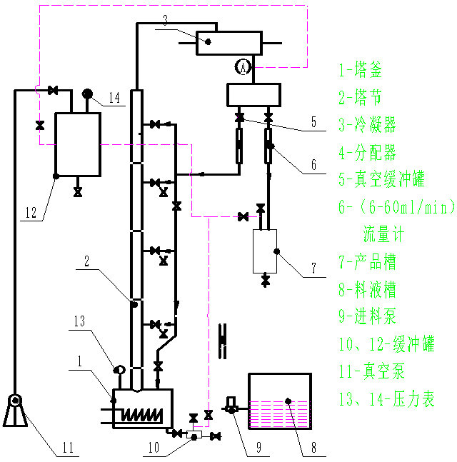 1、本實驗裝置主要由真空系統(tǒng)、真空緩沖罐、精餾塔、冷凝器、再沸器、料液泵、回流泵、壓力表、產(chǎn)品罐、原料罐、流量計、溫度儀表、溫度傳感器、316不銹鋼管道和閥門及保溫材料等組成。