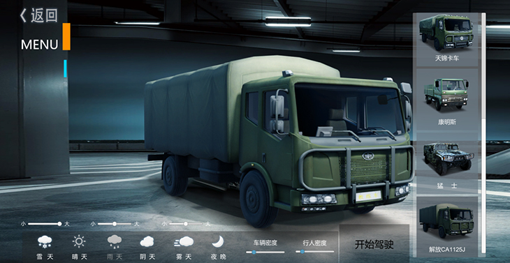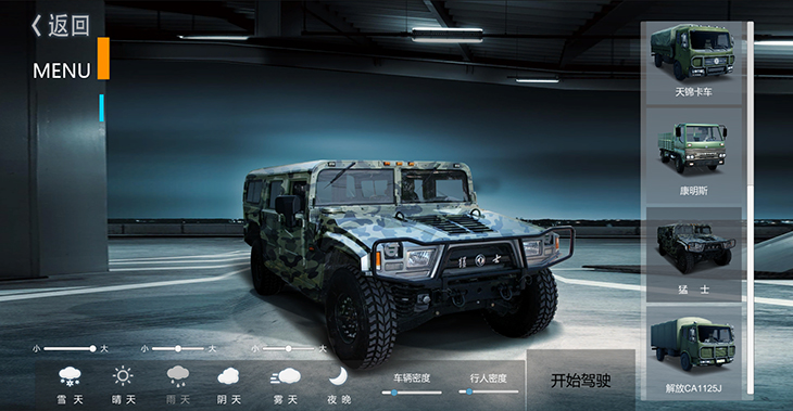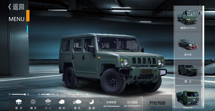 7.1、仿真車(chē)模型:10 種典型虛擬車(chē)輛模型:東風(fēng)猛士、北汽勇士、 EQ1118、EQ1121、 EQ2102、SX2150、SX2190、豪濼 ZZ2197、東風(fēng)天錦、大客車(chē)等,并可根據(jù)需要拓展、定制個(gè) 性化車(chē)輛模型。