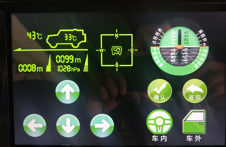 模擬器右邊觸摸屏: 確定、返回、上下左右功能鍵選擇,車(chē)內(nèi)和車(chē)外景切換。