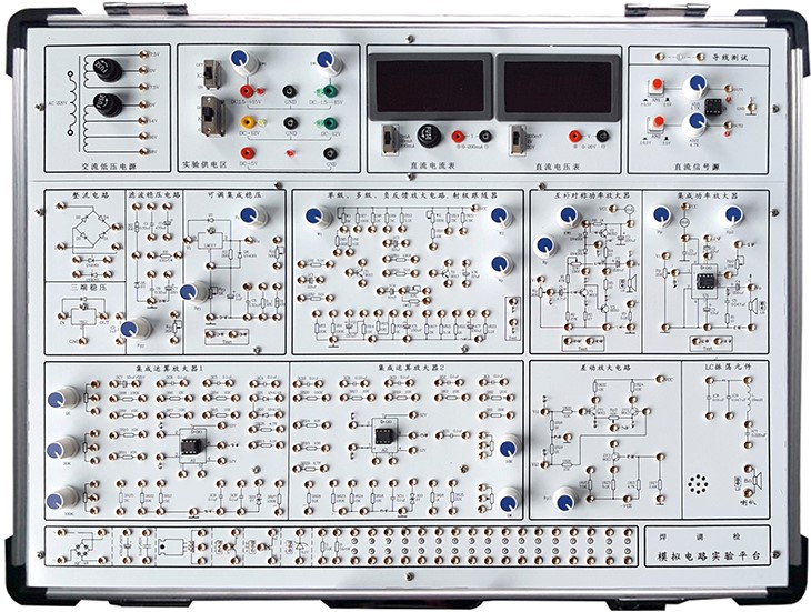 模擬電路實驗箱由鋁木合金箱體、高性能線性電源、和實驗電路板組成。其中實驗電路采用固定功能模塊方式,電路原理和元器件符號清晰,實驗用元器件可以焊裝在線路板的反面,安全可靠,不易損壞,也可以裝在線路板的正面,元件直觀可見,感性認識強,正面還有實驗電路原理圖,使學生在實驗時對原理一目了然。