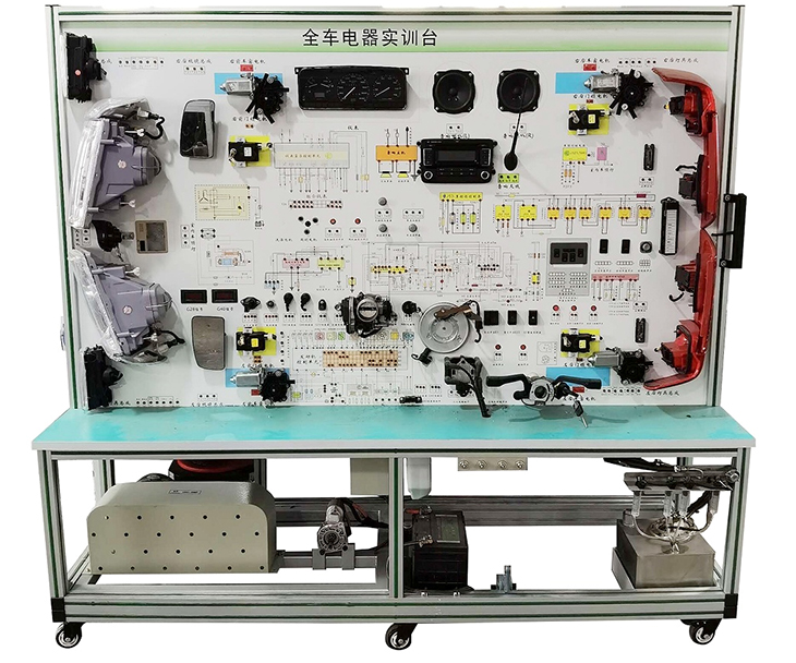 2.設(shè)備面板采用耐創(chuàng)擊、耐污染、防火、防潮的高級(jí)鋁塑板,表面經(jīng)特殊工藝噴涂底漆處理;面板打印有永不褪色的彩色電路圖;學(xué)員可直觀對(duì)照電路圖和實(shí)物,認(rèn)識(shí)和分析汽車整車電器各系統(tǒng)的工作原理。