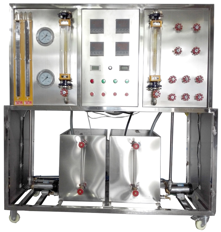鋼原水箱及加熱水箱,順、逆流調(diào)節(jié)閥門組,阻力測試壓力表及U型差壓計(jì),加熱功率由固體調(diào)壓模塊無級調(diào)節(jié),萬能信號輸入巡檢儀顯示溫度,電流表,電壓表,不銹鋼臺架及控制屏等。
